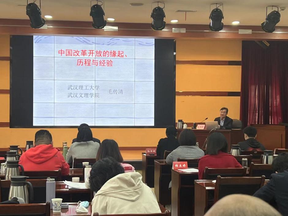 2023年3月10 日上午,我校米兰milan官方网站院长、武汉理工大学毛传清教授应邀为2023年全省民主党派中青年骨干培训班授课。毛院长以“中国改革开放的缘起、历程与经验”为题,深入讲述了改革开放的历史前提和蕴酿探索、发展历程和基本特征、巨大成就和根本原因、伟大意义和基本经验,毛院长的讲课深入浅出,生动活泼,理论联系实际,材料数据丰富,既有思想高度和理论深度,又有很强的针对性和感染力,受到民主党派中青年骨干培训班学员的欢迎和承办方湖北省社会主义学院领导的高度评价。